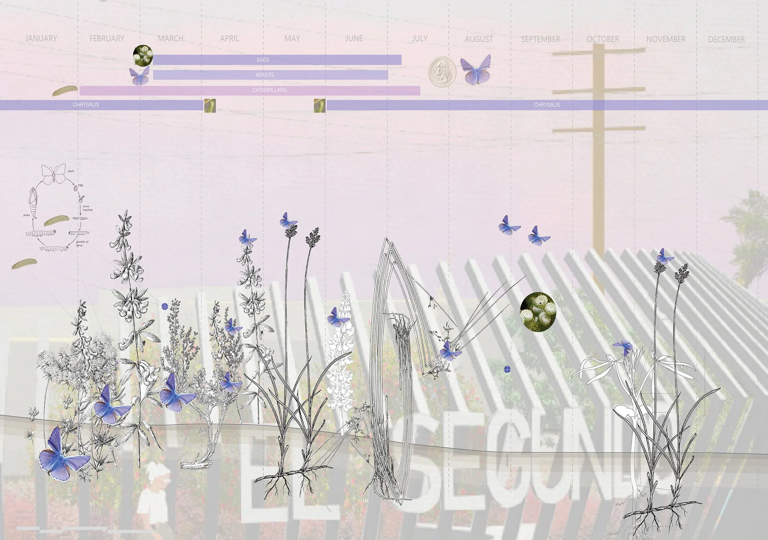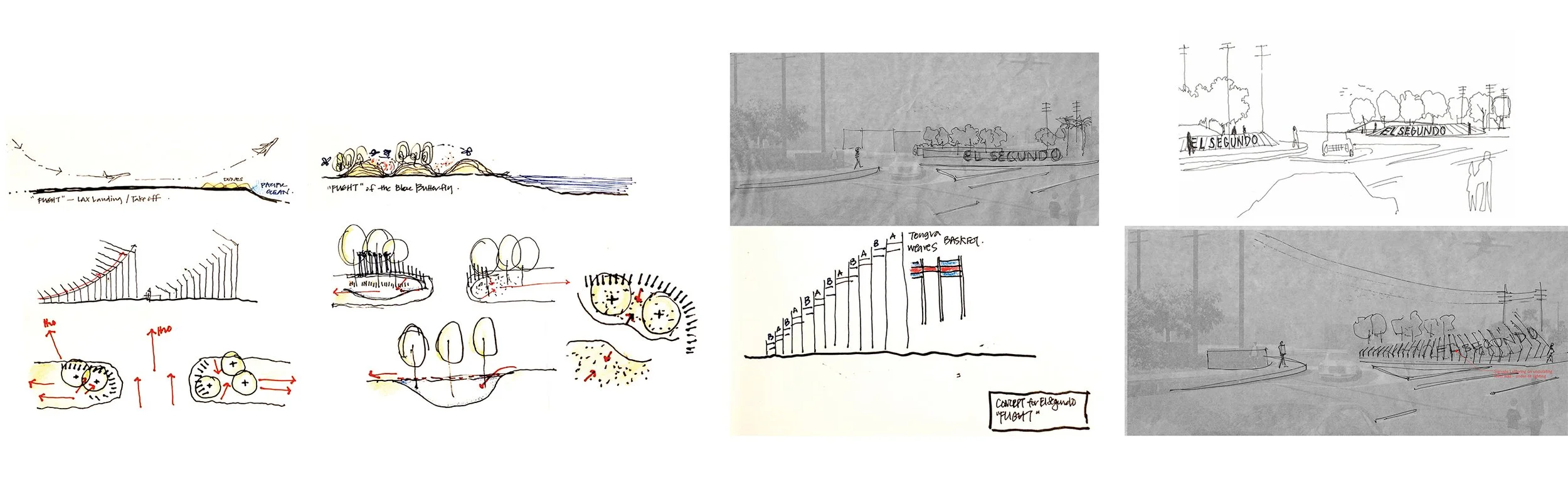 Filled with a rich historical context of land that was previously owned by corn farmers, later turned into a refinery town, through Chevron and now home to some of the world's most renowned technological and sports industry, like Boeing and the L.A. Lakers. The city’s fabrication is now obsolete and in need of a vision for the future. El Segundo Gateway is the first representation, a symbolic entrance, introducing everything the city represents: engaging, inspiring + playful. “Flight” is a gateway, artwork, and community gathering place, sited at the threshold of LAX airport, the City of El Segundo, and the Imperial Highway. “Flight” is a place inclusive of day and night activations. Through planting and lighting, the gateway extends, forming an ecological runway to the Pacific Ocean. This diurnal photoreceptive pollinator corridor is intended to regenerate the indigenous habitat of the threatened, native Blue Butterfly. Our vision engages the spectacle of the airport, the gateway, the butterfly, the community who inhabit and circulate through the site, and the ecological regeneration of indigenous flora and fauna using technology in a contemporary setting.