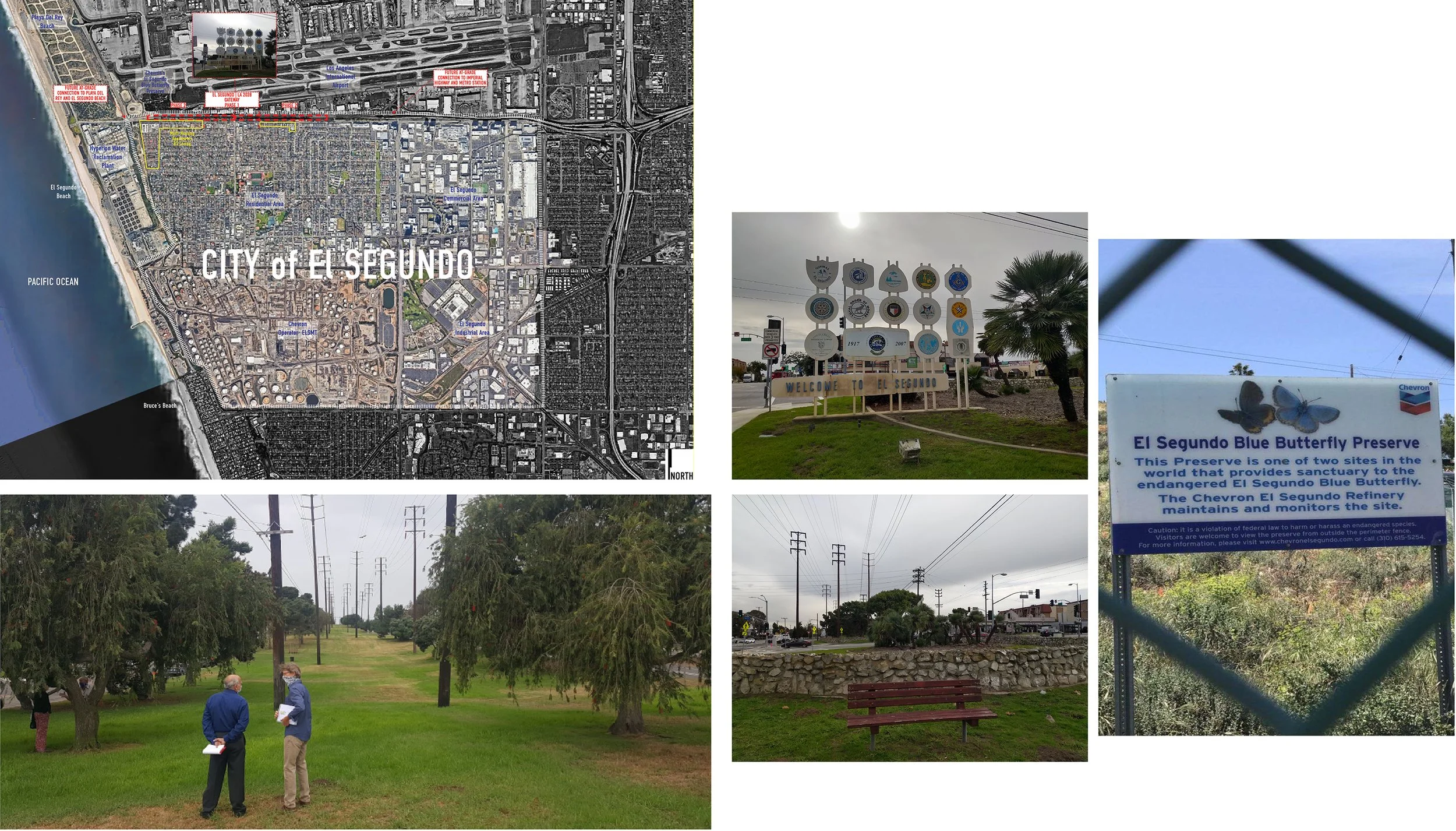 The site boundary extends from the intersection at the neighborhood’s western threshold eastward toward residential streets. The corridor is positioned at a uniquely layered point of convergence between regional mega-infrastructures and local lived environments. Immediately to the north, the runways and fuel logistics of Los Angeles International Airport (LAX) define the atmospheric and acoustic conditions of the site, producing persistent noise, particulate emissions, and airfield microclimates. To the south and southwest, the Chevron El Segundo Refinery, one of the largest petroleum-processing complexes on the West Coast, generates its own environmental burdens: heat islands, fugitive emissions, and ecological fragmentation, that directly shape the neighborhood’s ecological baseline. Within this heavily infrastructural context lies a small but significant ecological neighbor: the El Segundo blue butterfly (Euphilotes battoides allyni) preserve, maintained on Chevron-owned land. The preserve protects the federally endangered species whose life cycle depends exclusively on Seacliff Buckwheat (Eriogonum parvifolium), a plant once widespread along this coast but now surviving in fragmented patches. Although not contiguous with the project site, the preserve sits within the ecological catchment of the corridor. Its presence frames a critical question for the project: how might a linear streetscape serve as a connective habitat corridor, expanding the conditions necessary for the blue butterfly’s survival beyond the fenced boundaries of the preserve?