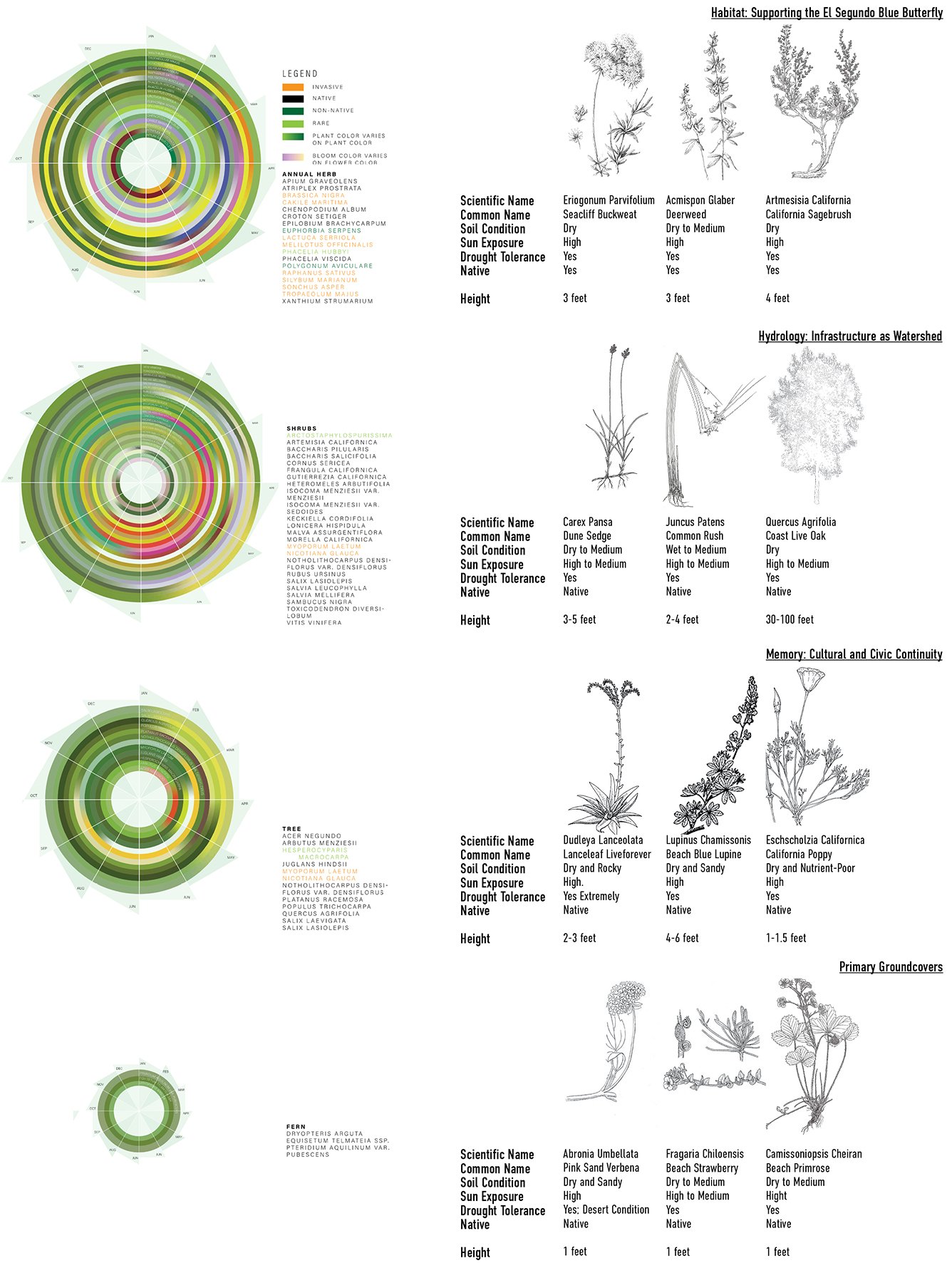 Restoration is grounded in the material and cultural conditions of this site: Tongva land practices, refinery and airport impacts, and the fragmented habitat of the El Segundo Blue Butterfly. Restoration here is procedural rather than symbolic, oriented toward reactivating interrupted ecological relations. The native Tongva’s understood material and shapes and rendering of existing conditions and understanding into the schematic design process.