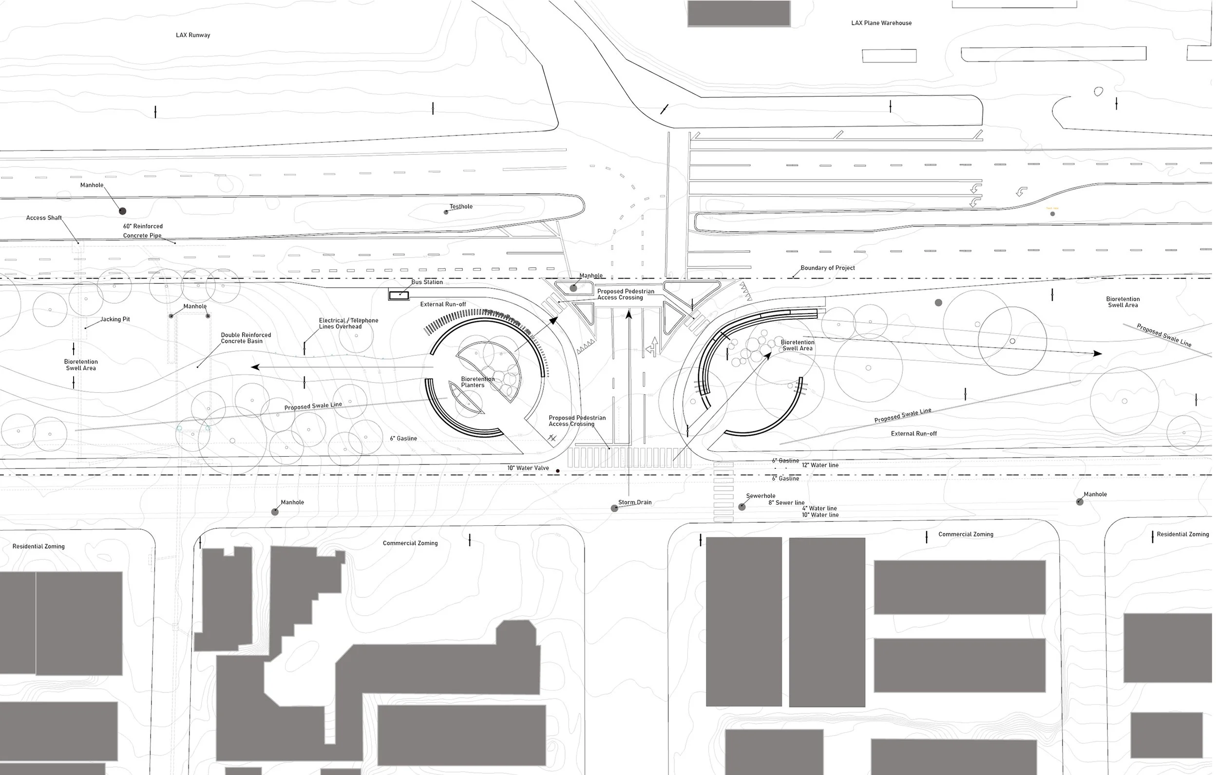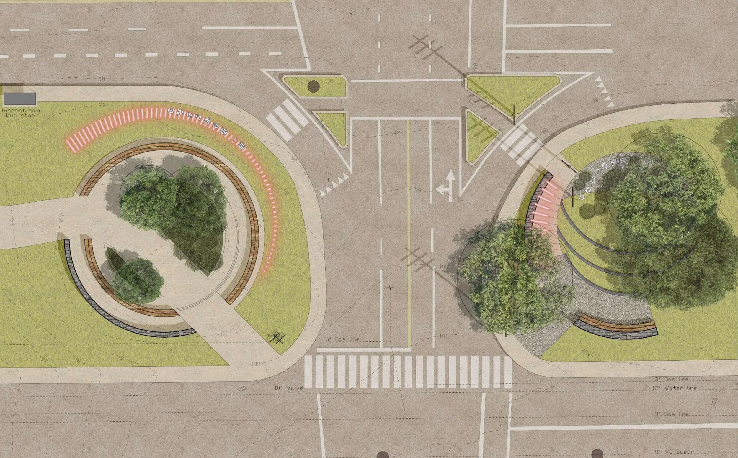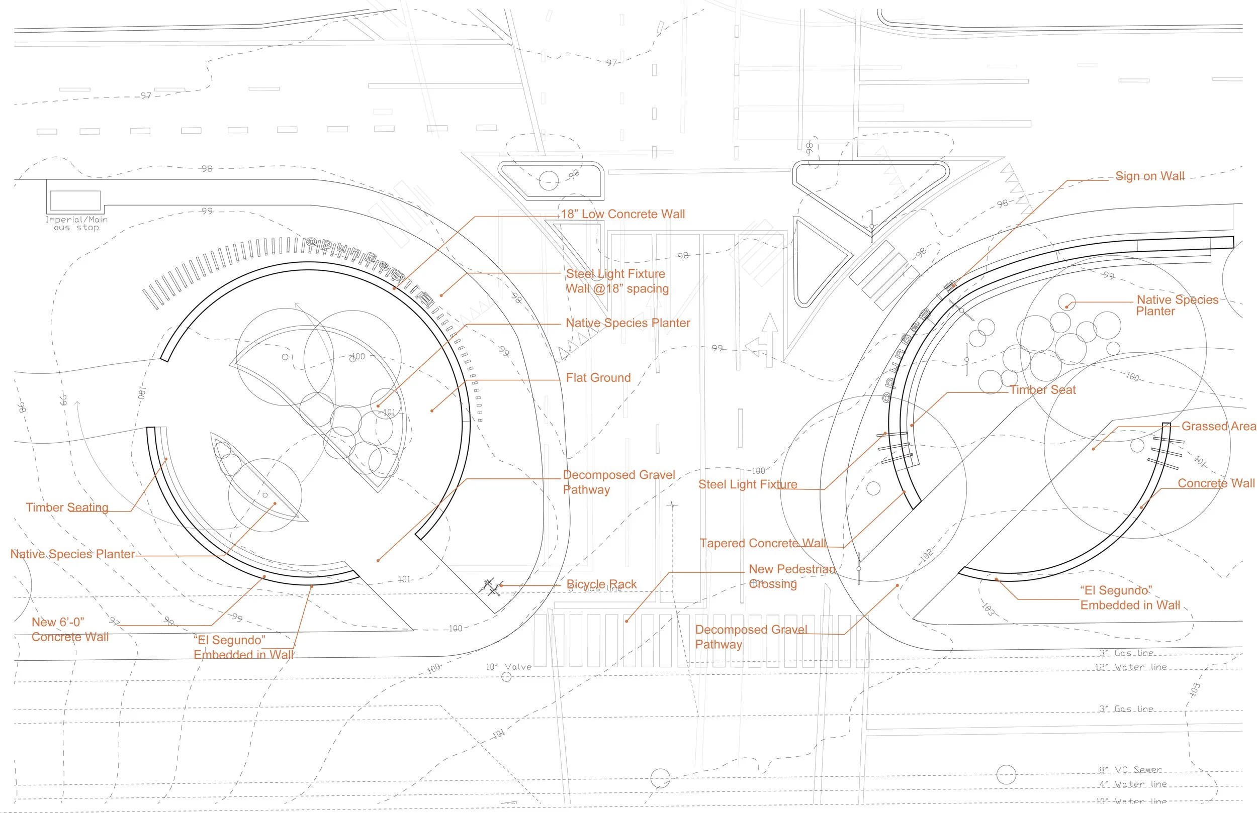 The design commission, issued by the City of El Segundo, was defined as an improvement to a neighborhood entry corridor, with programmatic goals centered on traffic calming, pedestrian safety, native planting, and the creation of a cohesive identity for the northern gateway. These constraints necessarily limited the intervention to the public right-of-way and precluded modifications to adjacent parcels, utility corridors, or privately owned industrial lands. Within this framework, the project seeks to demonstrate how a streetscape, often relegated to infrastructural maintenance and aesthetic enhancement, can operate as a site of ecological repair and cultural acknowledgment. Immediately east of the site, the residential fabric of El Segundo begins, a compact neighborhood shaped historically by the workforce of Chevron and, later, LAX. The project’s role as a gateway means it must negotiate between industrial edges and domestic life, absorbing environmental pressures while offering a threshold that is safe, legible, and ecologically generative. The corridor thus becomes a hinge: between the industrial and the domestic, the infrastructural and the ecological, the contemporary neighborhood and the deeper histories of Tongva stewardship.