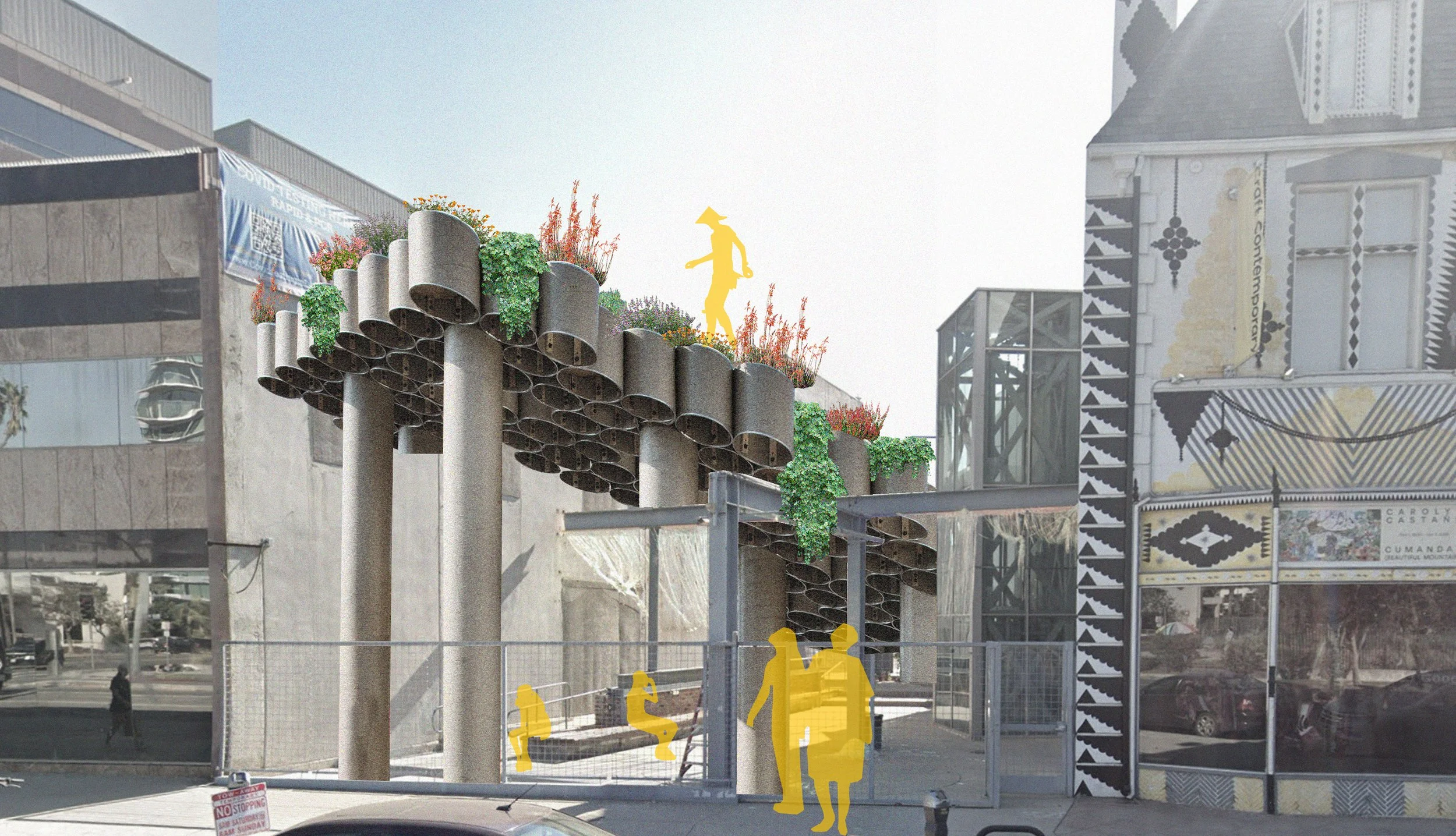 Los Angeles never really sits still. Buildings rise, seasons slip, communities overlap, and landscapes keep re-sprouting in ways both natural and entirely improvised. “Cycles of Change” joins that rhythm. For M&A’s courtyard at Craft Contemporary, we’re proposing a living installation, part garden, part classroom, part seasonal stage, where architecture doesn’t just stand there, but breathes, grows, and eventually disappears back into the soil. Forget steel and glass; our raw ingredients are soil, seed, water, sun. We’re working with cardboard tubes, adobe plasters, and natural fibers, materials that shade, filter, and scaffold life. Instead of lasting forever, they’re designed to fade gracefully: walls crumble, canopies fray, gardens seed themselves anew. It’s not demolition; it’s compost. Its Earth.